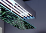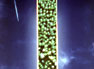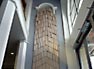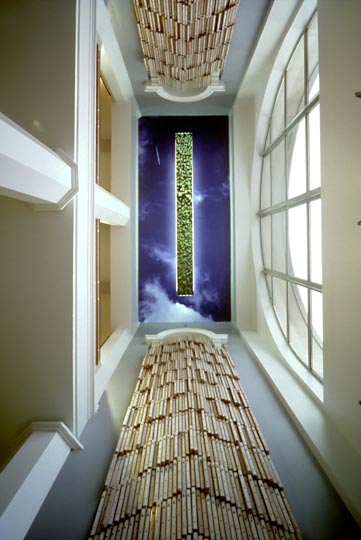 30,000 one-foot wooden rulers give concrete form to the almost incomprehensible altitude where the commercial passenger jet pictured high above is flying. Below that image, a backlit photograph on a suspended plane of glass depicts a Pacific Northwest forest as seen from an airplane at 2,000 feet, a common altitude for small aircraft. In pointing to this photo of trees, the 30,000 pieces of wood refer back to their source. The design of the artwork also plays with differing perceptions, offering simultaneous visions of looking up at the image of sky while looking down at the trees, and giving another shift of perspective when it is viewed from the building's mezzanine