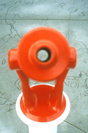 Imagine you could look through a hole on the ground at the undersides of other continents and countries on the other side of the world. This telescope and map allows you to picture at what direction and angle those far away places are. Aim the telescope at Japan or Spain on the map and you are looking in a straight line directly towards that actual spot on the other side of the world.