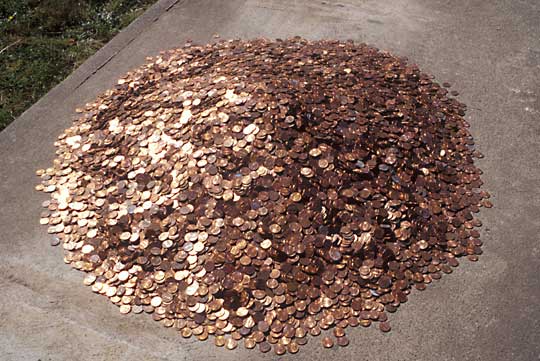 The entire $500 honorarium from the Sand Point Arts and Cultural Exchange was converted into pennies and placed at a public corner at Sand Point with a Do Not Touch sign. The pile lasted two weeks and then disappeared overnight. While it was there, silver coins were found added to the pile on several occasions. A few pieces of costume jewelry were found in the pile as well. The parks department reported that at one point some children living nearby were found by their parents to have filled their backpacks with pennies and hauled them home. The parents made the kids put the coins back and to add their allowance money. A few days later all the coins were taken. Concepts that inspired this artwork: Distribution of wealth, erosion, all-you-can-eat, take-what-you-need, sink holes, money pits, death by a thousand cuts, gluttony, preservation, donation, allocation, free refills, oxygen bars, strip mines, pruning, skimming, looting, and dirt.
